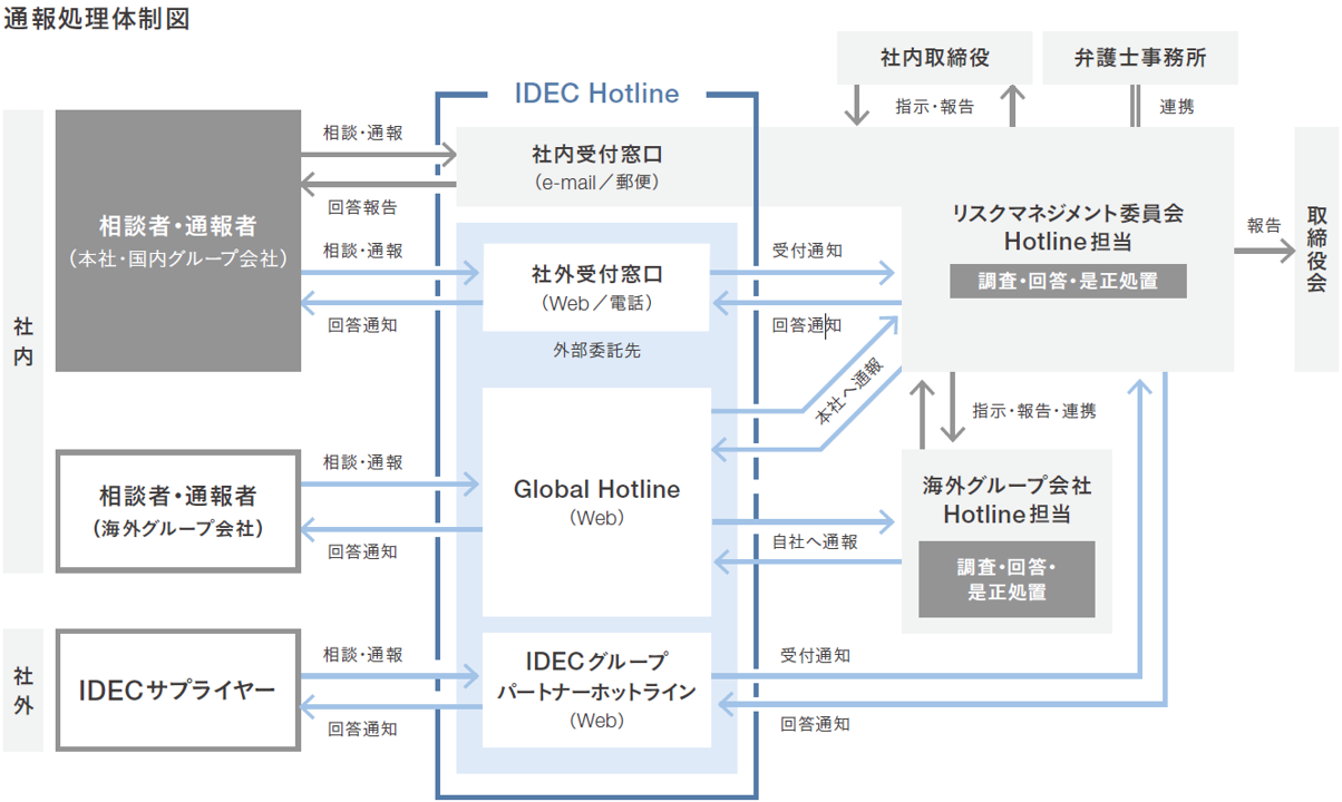 「IDEC Hotline」を設置し、利用者の状況に合わせて「社外窓口/社内窓口」「匿名/顕名」での通報が可能な仕組みを構 築しています。内部通報運用規程を定め、相談・通報の秘密を 守るとともに、利用者への不利益な取り扱いを禁止しています。通報があった際は、リスクマネジメント委員会内に設置された「Hotline担当」が迅速に対処し、解決と再発防止策を図ります。また通報は速やかに経営層へ通知されるとともに、定期的に取締役会に報告してリスク情報の共有を図る一方、経営層の関与がある場合などは 状況に応じて独立性を確保し、外部の弁護士事務所と 連携するなどの仕組みとしています。