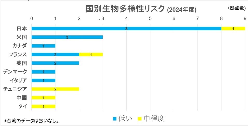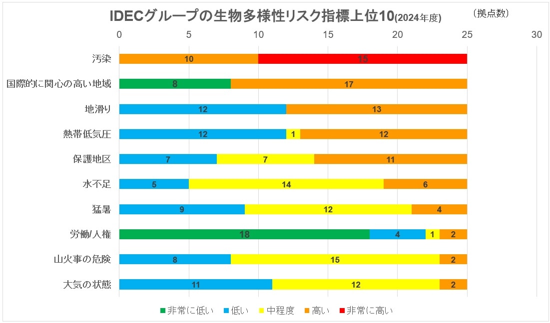 生物多様性リスクの分析IDECグループの事業活動が生物多様性に与える影響や生物多様性実績のモニタリングに参考となる指標を定義するために、2023年度よりIDECグループの生物多様性リスクの分析と評価を実施しました。評価ツールには世界自然保護基金(WWF) が開発したBiodiversity Risk Filterを活用し、国別の生物多様性リスクを定量化しました。合わせて、グループ全体での生物多様性リスク指標の上位10項目を特定しました。 |