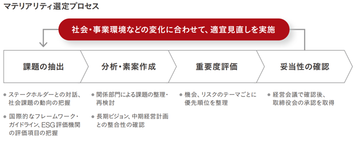 2023年に、2050年のありたい姿、2030年のビジョンを策定したことに伴い、マテリアリティ(重点課題)についても見直しを行い、「企業基盤」として人的資本やガバナンスの一層の強化を盛り込みました。また、2024年には外部環境などを踏まえてマテリアリティの一部を見直し、人権の尊重を新たに追加するとともに、2030年の目指す姿も変更しました。